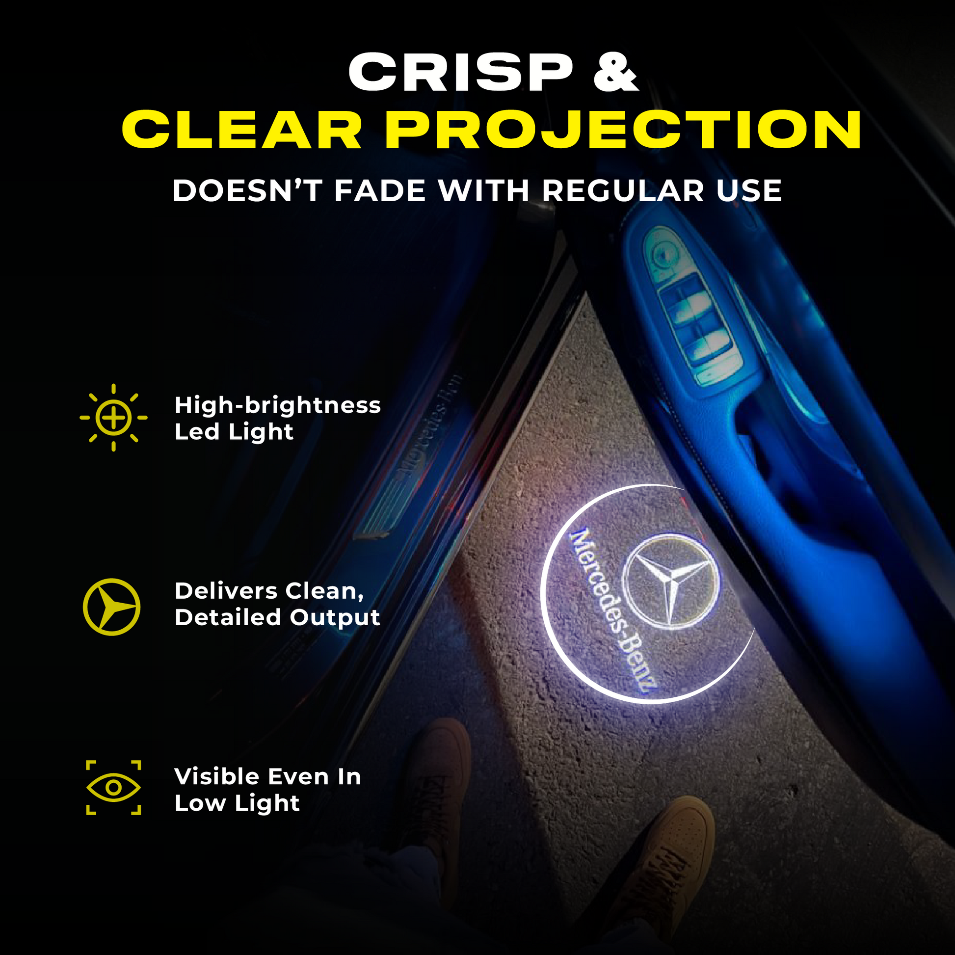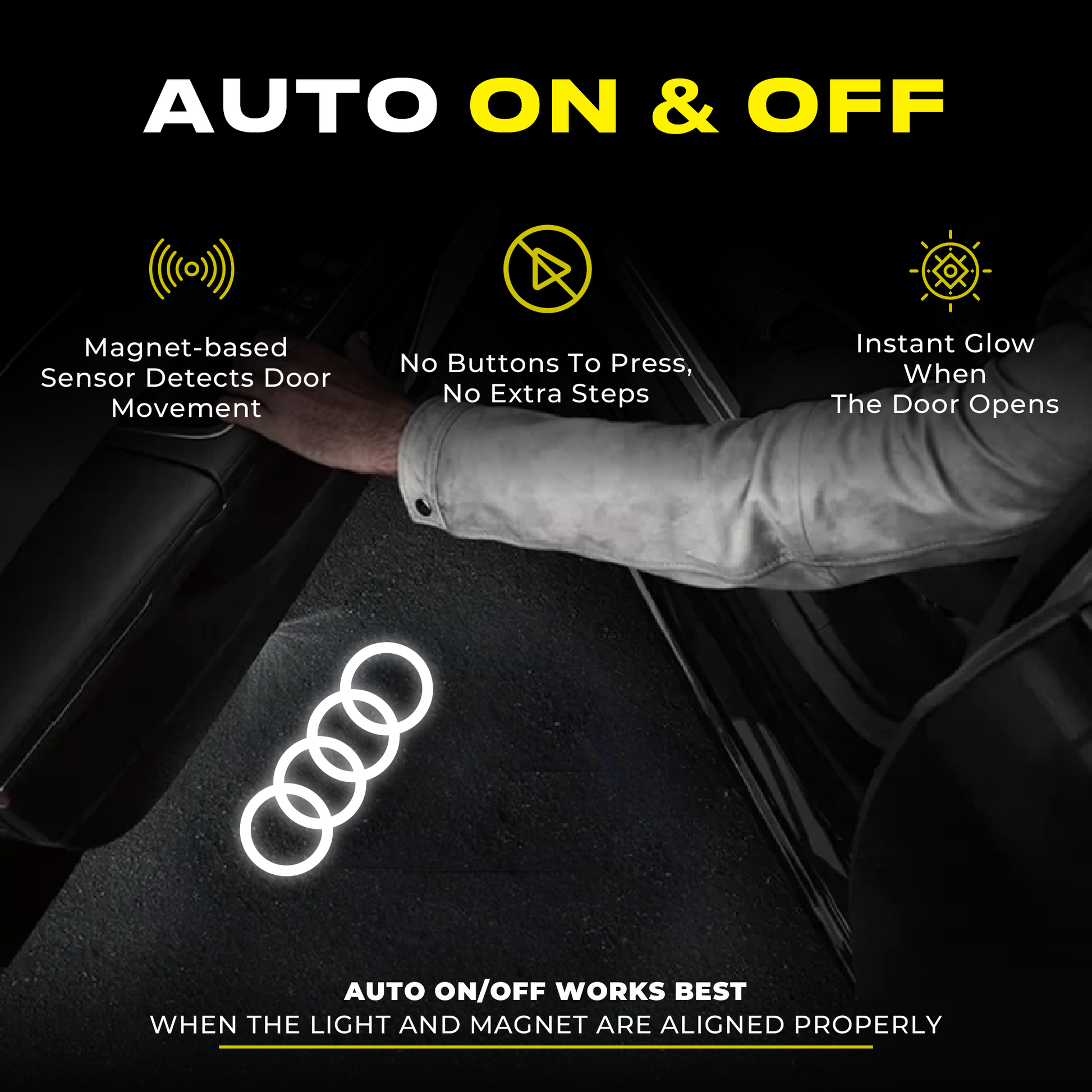 SUPER-STRONG PROJECTION:?Its high-brightness LED chip and projection lens projects cool and crispy car logos on the ground when you open the door. How about some neat brightness down the ground?