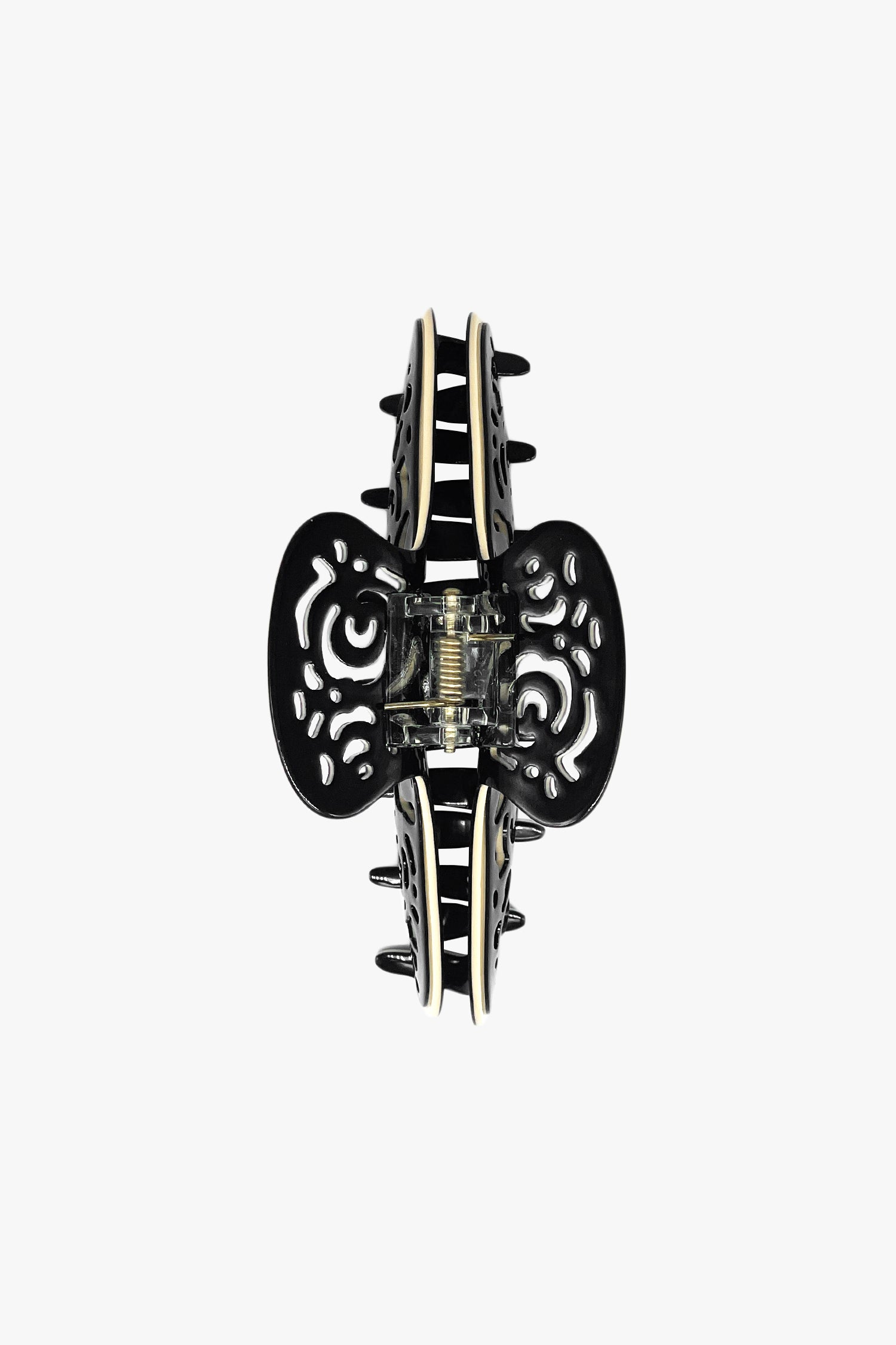 Add a touch of vintage elegance to your look with our Black & White Two-Tone Open Scroll Jaw Clip. The perfect accessory for both everyday wear and special occasions.